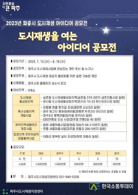 한국소통투데이 관리자 기자 | 파주시는 2023년 파주시 도시재생 아이디어 공모전을 개최함에 따라, 8월 16일까지 아이디어 신청을 받는다.