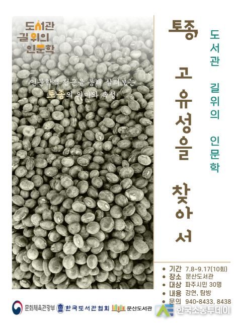 한국소통투데이 관리자 기자 | 파주 문산도서관은 지난해에 이어 올해도 문화체육관광부가 주최하고 한국도서관협회가 주관하는 도서관, 길 위의 인문학 프로그램에 선정되어 ‘토종, 고유성을 찾아서’라는 주제로 9월 17일까지 매주 토요일에 강의를 진행한다.