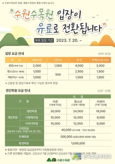 한국소통투데이 관리자 기자 | 수원시가 무료로 운영했던 수원수목원(일월·영흥수목원)을 7월 20일부터 유료 입장으로 전환한다.