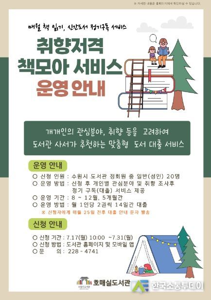 한국소통투데이 관리자 기자 | 수원시 호매실도서관은 시민 맞춤형 도서 대출 서비스인 ‘취향저격 책모아 서비스’ 참여자를 17일부터 31일까지 모집한다.