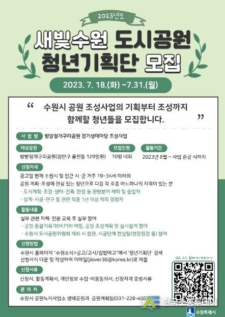 수원시공원녹지사업소 관계자는 “새빛수원 도시공원 청년기획단이 뉴노멀1) 을 선도하는 청년세대의 다양하고 감각적인 아이디어를 수원시 공원사업에 담아내길 바란다”며 “관심 있는 청년들의 많은 지원을 바란다”고 말했다.