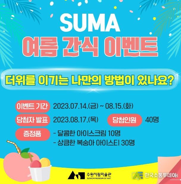 또한 폭염이 지속되는 올해 여름을 시원하게 보낼 수 있도록 'SUMA 여름 간식 이벤트'를 미술관 SNS에서 개최한다. 미술관 공식 인스타그램과 페이스북에서 ‘더위를 이기는 나만의 방법’을 댓글로 남기면 추첨을 통해 총 40명에게 아이스크림과 아이스티 음료 기프티콘을 증정한다. 해당 이벤트는 8월 15일까지 진행되며 미술관 SNS를 팔로우하면 참여 가능하다.