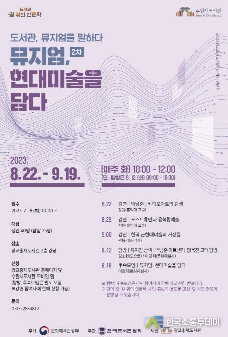 한국소통투데이 관리자 기자 | 수원시 광교홍재도서관이 2023년 길 위의 인문학 ‘도서관, 뮤지엄을 말하다 : 2차 뮤지엄, 현대미술을 담다’ 수강생 40명을 18일 오전 10시부터 선착순으로 모집한다.
