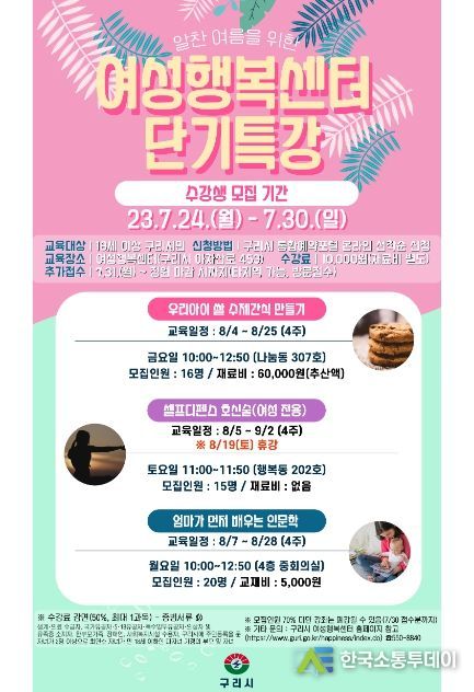 한국소통투데이 관리자 기자 | 구리시는 오는 7월 24일부터 7월 30일까지 ‘여성행복센터 단기특강’ 수강생을 모집한다.