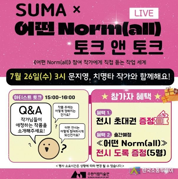 한국소통투데이 관리자 기자 | 경기도 수원시 수원시립미술관은《어떤 Norm(all)》전시 연계 세 번째 프로그램 '《어떤 Norm(all)》 × 아티스트 토크〉를 7월 26일(수) 오후 3시 수원시립미술관에서 개최한다.