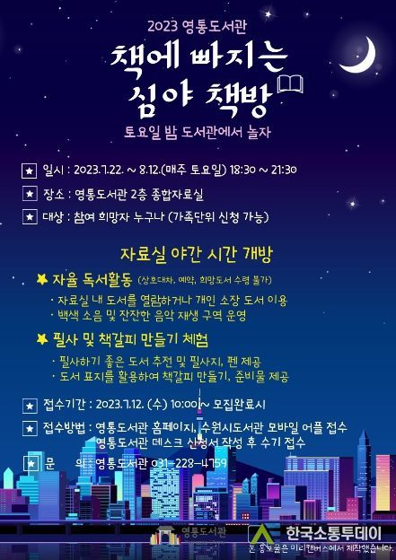 한국소통투데이 관리자 기자 | 수원시 영통도서관이 7월 22일부터 8월 12일까지 매주 토요일 ‘책에 빠지는 심야 책방’을 운영한다.