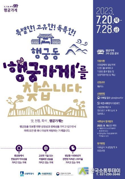 한국소통투데이 관리자 기자 | 수원문화재단은 행궁동만의 특색이 담긴 가게를 발굴하여 관광자원으로 육성하고 골목상권을 활성화하기 위한 행궁동 ‘행궁가게’ 2차 선정 공모를 실시한다.
