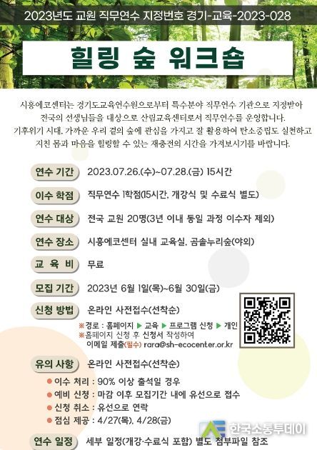한국소통투데이 관리자 기자 | 시흥시가 2023년도 교원직무연수 ‘힐링 숲 워크숍’ 프로그램을 시흥에코센터에서 7월 26일부터 사흘간 진행한다.