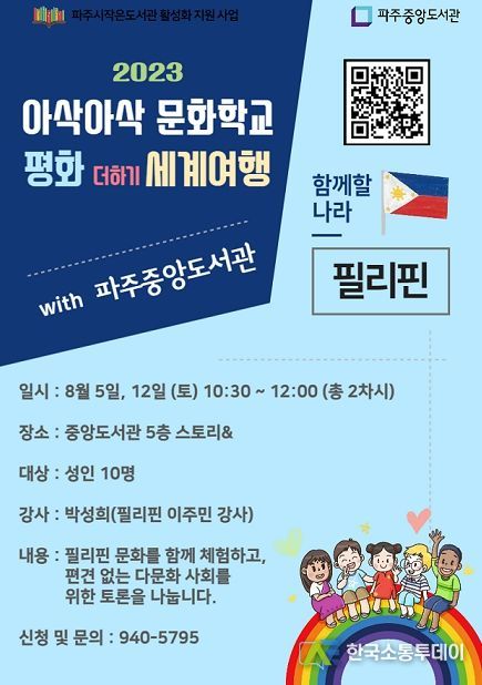 한국소통투데이 관리자 기자 | 파주중앙도서관은 8월 5일과 12일에 중앙도서관 5층 스토리앤에서 필리핀 이주민 강사와 함께하는 다문화 강좌 ‘아삭아삭 문화학교 평화+ 세계여행: 필리핀’을 진행한다.