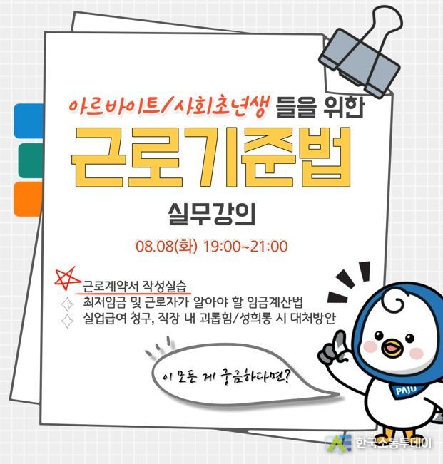 한국소통투데이 관리자 기자 | 파주시는 8월 4일까지 기초 노동법 강의에 참여할 청년(만 19~34세) 16명을 선착순으로 모집한다.
