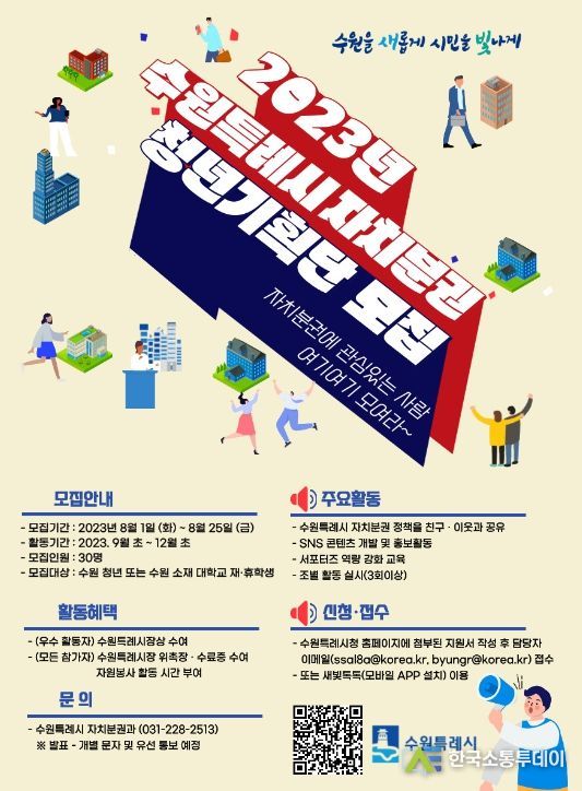 한국소통투데이 관리자 기자 | 수원시가 SNS를 활용해 수원시 자치분권 정책을 홍보하고, 자치분권 관련 행사를 지원하는 역할을 할 ‘수원특례시 자치분권 청년기획단’을 8월 1일부터 25일까지 모집한다.