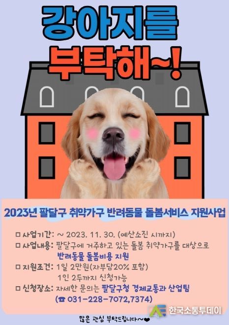 한국소통투데이 관리자 기자 | 수원시 팔달구는 관내 취약가구를 대상으로 반려동물 돌봄서비스 비용의 일부를 지원해주는 ‘취약가구 반려동물 돌봄서비스 지원사업’이 진행 중이다.
