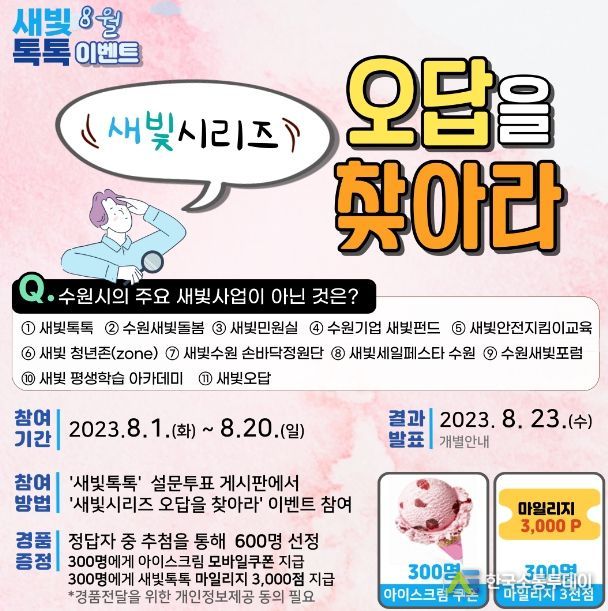한국소통투데이 관리자 기자 | 수원시가 8월 1일부터 20일까지 ‘새빛톡톡’ 8월 이벤트 ‘새빛시리즈, 오답을 찾아라’를 연다.