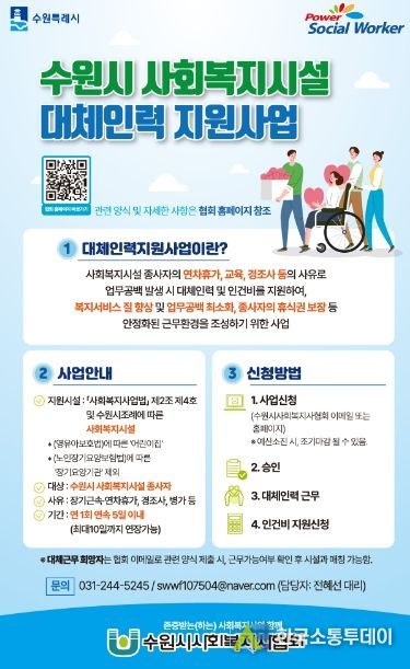 한국소통투데이 관리자 기자 | 수원시가 사회복지시설에서 단기결원이 발생했을 때 대체인력의 인건비를 지원하는 ‘수원시 사회복지시설 대체인력 지원사업’을 개시했다. 총사업비는 3000만 원이다.