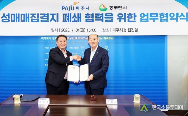 한국소통투데이 관리자 기자 | 파주시와 동두천시는 31일 파주시청 접견실에서 김경일 파주시장, 박형덕 동두천시장을 비롯해 관계 공무원 등 10여 명이 참석한 가운데 성매매집결지 폐쇄를 위한 업무협약을 체결했다.