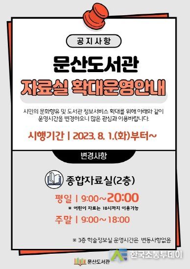 평일 18시까지만 운영하던 2층 종합자료실을 20시까지 2시간 확대 운영한다. 단, 어린이 자료실과 3층 학술정보실은 기존과 동일하게 운영한다.
