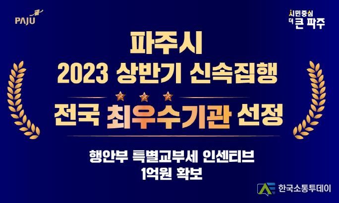 한국소통투데이 관리자 기자 | 파주시가 행정안전부가 전국 243개 자치단체를 대상으로 평가하는 '2023년 지방재정 신속집행 상반기 평가'에서 전국 ‘최우수기관’으로 선정되는 영예를 안았다.