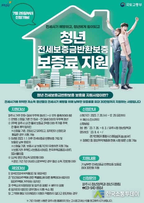 한국소통투데이 관리자 기자 | 파주시는 ‘청년 전세보증금반환보증 보증료’를 최대 30만 원까지 지원한다.