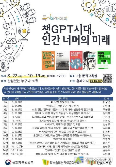 이번 강의는 ‘챗지피티(GPT) 시대, 인간 너머의 미래’라는 주제로 15회에 걸쳐 진행된다. 한빛도서관은 강의를 통해 챗지피티(GPT) 등 인공지능이 나날이 발전하는 현시대를 어떻게 살아가야 할지, 우리가 발견할 새로운 기회 혹은 가능성은 무엇인지, 동시에 그 속에 내포된 위협은 무엇인지를 살펴보면서, 모두가 희망할 수 있는 미래의 모습에 대한 지혜를 모으고자 한다.