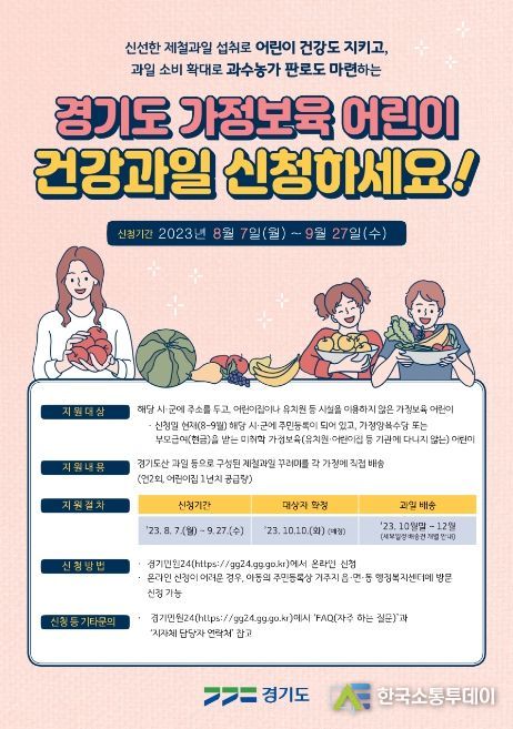 한국소통투데이 관리자 기자 | 수원시는 8월 7일부터 9월 27일까지 ‘2023년 경기도 가정보육 어린이 건강과일 공급사업’ 참여자를 모집한다.