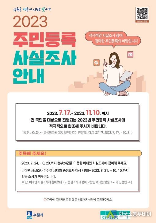 한국소통투데이 관리자 기자 | 수원시 장안구는 전 구민을 대상으로 주민등록지와 실거주지 불일치 해소를 위한 2023년 주민등록 사실조사를 오는 11월 10일까지 추진한다.