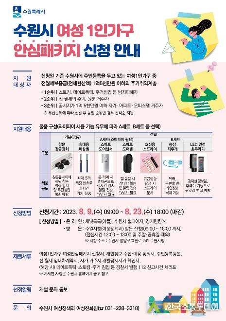 수원시는 8월 9일부터 23일까지 ‘수원시 여성1인가구 여성안심 패키지 지원사업’에 참여할 240여 가구를 모집한다. 범죄에 취약한 여성1인가구에 ‘안심물품’을 지급하는 사업이다.