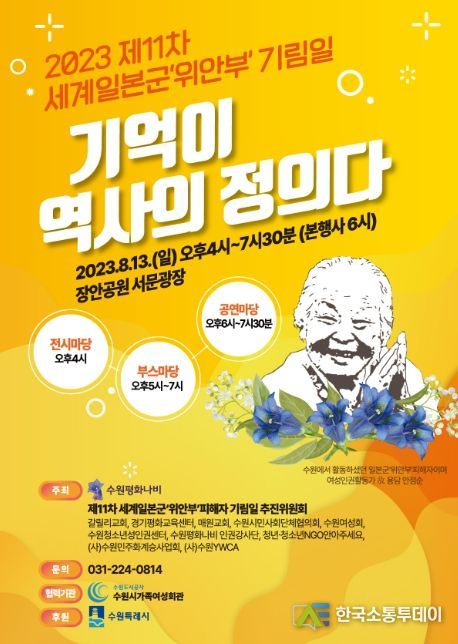 한국소통투데이 관리자 기자 | 8월 13일 오후 4시 수원 장안공원 서문광장에서 ‘제11차 세계일본군 ‘위안부’ 피해자 기림일’ 행사 ‘기억이 역사의 정의다’가 열린다.