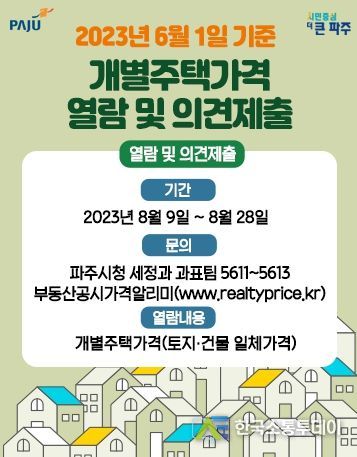 한국소통투데이 관리자 기자 | 파주시는 2023년 6월 1일 기준 개별주택(단독, 다가구, 다중, 주상용) 가격을 8월 9일부터 28일까지 주택소유자나 이해관계인 등이 열람할 수 있도록 하고 그와 관련된 의견을 받는다.