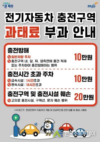 한국소통투데이 관리자 기자 | 파주시는 친환경 자동차 보급 확대에 따라 전기자동차 이용자의 편의 제고를 위해 전기자동차 충전구역 내 충전방해 행위에 대한 단속을 실시하고 있다.