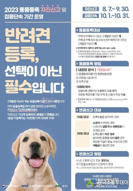 한국소통투데이 관리자 기자 | 수원시가 동물의 보호와 유실‧유기를 방지하고, 동물등록률을 높이기 위해 9월 30일까지 ‘동물등록 자진신고 기간’을 운영한다.