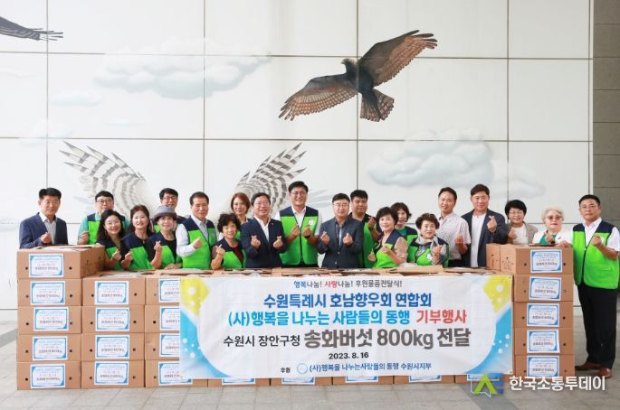 한국소통투데이 관리자 기자 | 수원시 호남향우 회원으로 구성된 (사)행복을 나누는 사람들의 동행에서 지난 16일, 장안구에 10kg 80박스, 총 1,600만원 상당의 송화버섯을 전달했다.