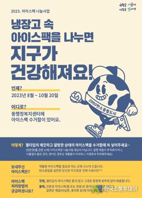 수원시 관계자는 “여름철에 사용량이 급증하는 아이스팩은 미세 플라스틱이 주성분인 경우가 많아 그냥 버리면 심각한 환경오염을 유발할 수 있다”며 “환경보호를 위해 아이스팩 나눔 사업에 적극적으로 동참해달라”고 말했다.