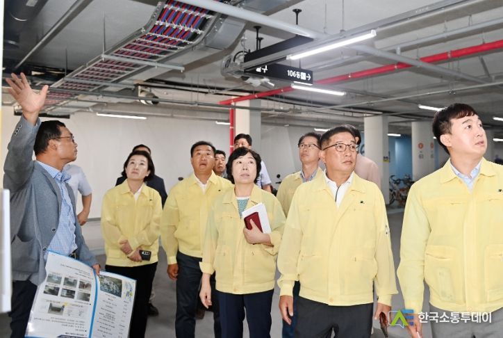 파주시의회 도시산업위원들은 파주시 주택과장을 비롯한 소관부서 담당자들과 함께 현장에서 지하주차장 무량판 구조 보강공사 상황을 직접 확인하고, 건축물 안전 및 환경개선 사항에 대해 논의했다.