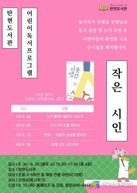 한국소통투데이 관리자 기자 | 파주시 탄현도서관은 8월 30일부터 9월 20일까지(매주 수) 총 4회에 걸쳐 어린이 독서프로그램 '작은 시인'을 운영한다.