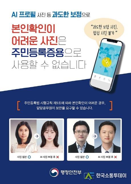 이는 최근 인공지능(AI)으로 만든 사진이 유행하면서 변형이 가능하거나 본인 확인이 어려운 사진은 주민등록증에 사용할 수 없다는 행정안전부의 지침에 따른 것이다.