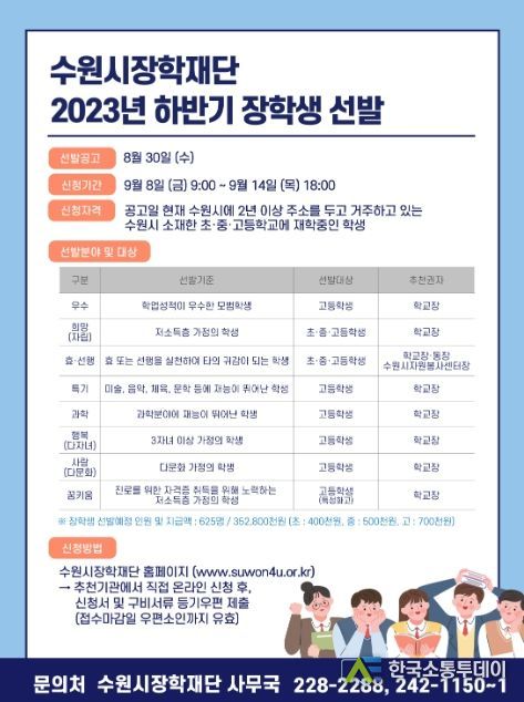 한국소통투데이 관리자 기자 | 수원시장학재단이 수원시 소재 초·중·고등학생을 대상으로 2023년도 하반기 장학생 625명을 선발한다.
