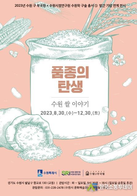 수원 구 부국원은 수원시정연구원의 수원학 구술 총서⑤ '품종의 탄생 : 농학자가 들려주는 수원 품종 이야기' 발간을 기념해 12월 30일까지 전시회 ‘품종의 탄생 : 수원 쌀 이야기’를 연다.