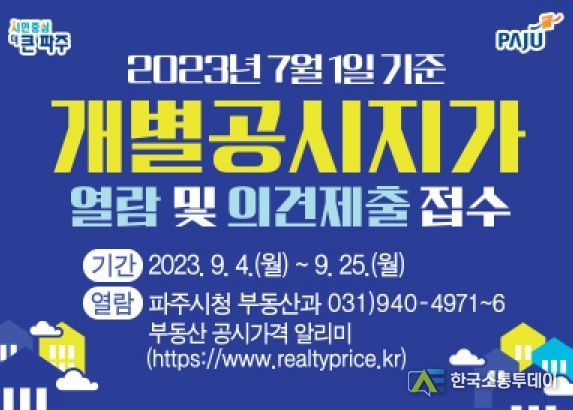 한국소통투데이 관리자 기자 | 파주시는 2023년 7월 1일 기준으로 산정한 개별공시지가에 대해 9월 4일부터 25일까지 열람 기간을 운영하고 토지 소유자 및 이해 관계인의 의견을 접수한다.
