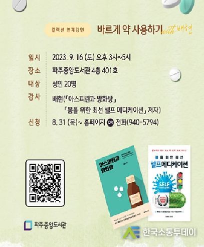 한국소통투데이 관리자 기자 | 파주시 중앙도서관은 9월 16일 ’아스피린과 쌍화탕‘의 저자 배현 작가를 초청해 작가와의 만남을 개최한다.