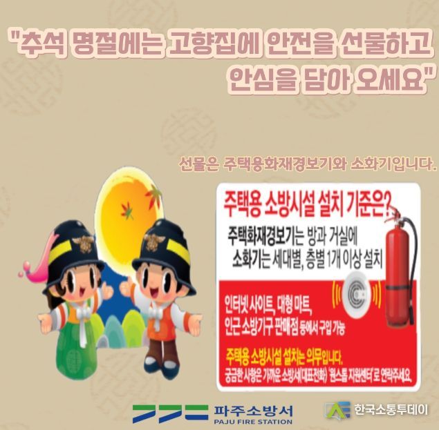 한국소통투데이 관리자 기자 | 파주소방서는 추석을 앞두고 파주시민들이 안전하고 편안한 명절을 보낼 수 있도록 ‘2023년 추석 명절 대비 화재예방대책’을 진행중이라고 4일 밝혔다.