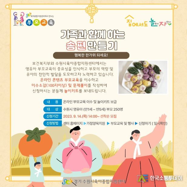 이수 소감은 14일 오후 2시부터 15일 23시까지 수원시육아종합지원센터'가정양육지원'부모교육 및 행사'신청하기에서 신청하면 된다. 선착순 300명에게만 송편놀이키트가 제공된다.