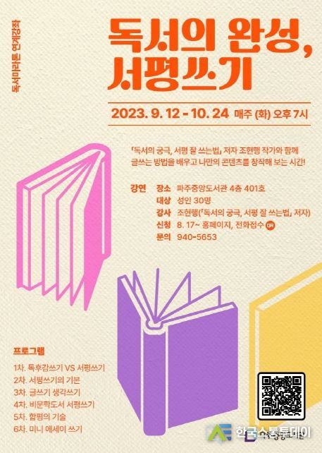 한국소통투데이 관리자 기자 | 파주시 중앙도서관은 9월 12일부터 10월 24일까지 성인을 대상으로 하는 '독서의 완성, 서평 쓰기' 강좌를 운영한다.