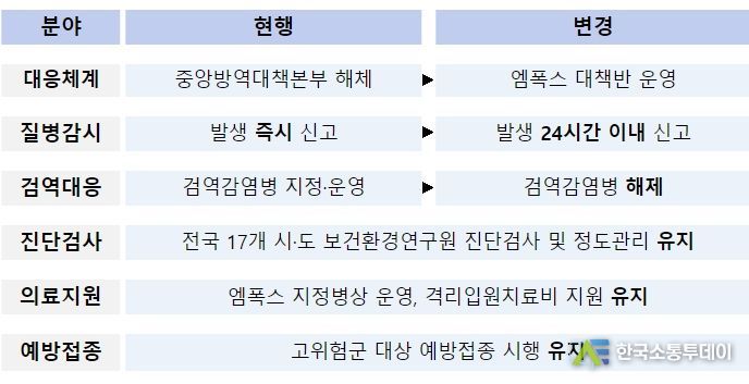 위기경보 단계 하향에 따른 변경되는 사항은 다음과 같다. ▲기존의 중앙방역대책본부에서 대책반으로 대응체계를 전환하며, ▲신고 등 감시체계가 변경되고, ▲검역감염병 해제에 따라 일부 방역 조치가 완화될 예정이다.