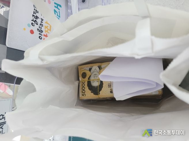 6일 오전 9시 30분께 모자를 눌러쓰고 선글라스를 낀 중년 여성이 광교2동행정복지센터로 들어와 민원대 위에 종이봉투를 올려놓은 후 아무 말도 하지 않고 나갔다. 종이봉투 안에는 5만 원권 뭉치와 손 편지가 들어있었다.