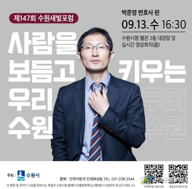 수원시는 9월 13일 오후 4시 30분 시청 대강당에서 ‘사람을 보듬고 키우는 우리 수원’을 주제로 제146회 수원새빛포럼을 연다.