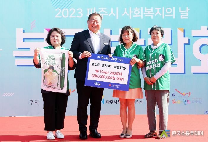 한국소통투데이 관리자 기자 | 파주시는 6일 파주시 홍보대사 가수 송민준 팬카페 ‘대한민준’으로부터 관내 저소득 노인을 위한 쌀(10kg) 200포를 전달받았다고 밝혔다.