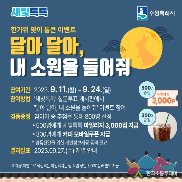 한국소통투데이 관리자 기자 | 수원시가 한가위를 맞아 11~24일 ‘새빛톡톡’에서 댓글로 소원을 적는 이벤트 ‘달아 달아, 내 소원을 들어줘’를 진행한다.