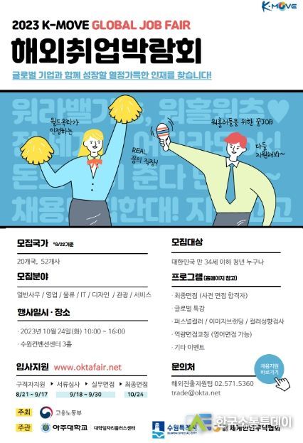 참여를 원하는 청년은 9월 17일 오후 6시까지 ‘2023 K-MOVE 해외취업박람회’ 홈페이지에서 지원하면 된다. 9월 18~30일 서류심사와 실무면접을 거쳐, 10월 24일 수원컨벤션센터에서 ‘2023 K-MOVE 해외취업박람회’ 최종 면접이 진행될 예정이다.