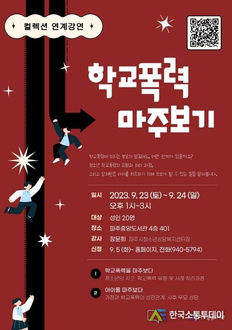 한국소통투데이 관리자 기자 | 파주시 중앙도서관은 오는 23~24일 중앙도서관 4층에서 학교폭력 마주보기 강연을 개최한다.