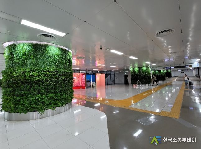 대합실 바닥에 초록색 인조 잔디와 걸터앉을 수 있는 직육면체 모양 의자를 설치해 시민들이 편히 쉬어갈 수 있는 공간을 만들었다. 지하 1층에 있는 8개 원형 기둥 벽은 테이블 야자, 산호수, 스킨답서스 등 초록색 식물로 꾸몄다.